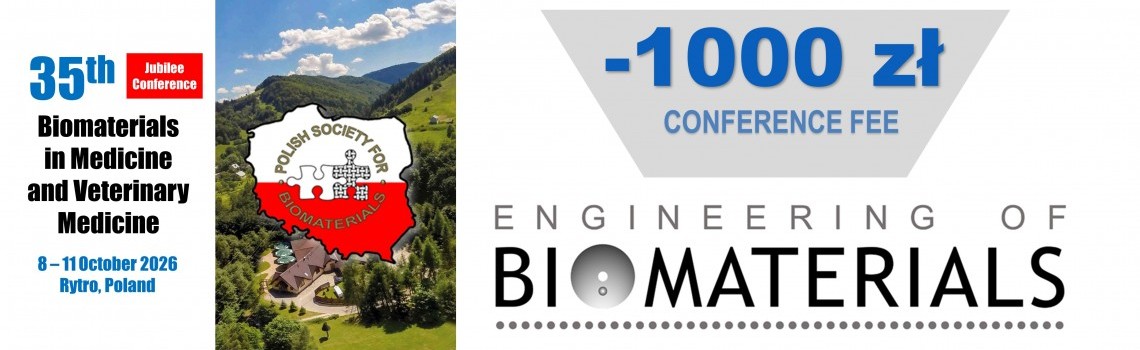 Jeśli planują Państwo wziąć udział w jubileuszowej konferencji 35th Conference Biomaterials in Medicine and Veterinary Medicine, która odbędzie się w dniach 8-11 października 2026 roku w Rytrze, zachęcamy do przesłania swojego manuskryptu do czasopisma ‘Engineering of Biomaterials’ wydawanego przez PSB. Dzięki temu możliwe jest otrzymanie zniżki w wysokości 1000 zł na opłatę konferencyjną i świętowanie z nami jubileuszu konferencji oraz 30-lecia Stowarzyszenia w niższej cenie!
